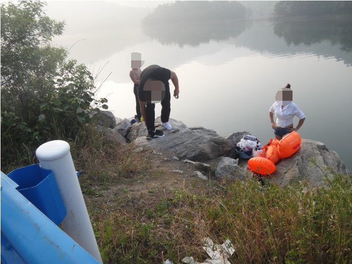 6.:54分,接到消息,被执行人张某正在景区龙潭河水库里游泳,另一组干警一刻也不敢耽搁,开着警车直奔景区,来到水库旁看到张某的游泳装备还真齐全,这名老赖还真会享受,迎着晨光,畅游在水里,可是这一切在看到执行干警的时候都要停止了。