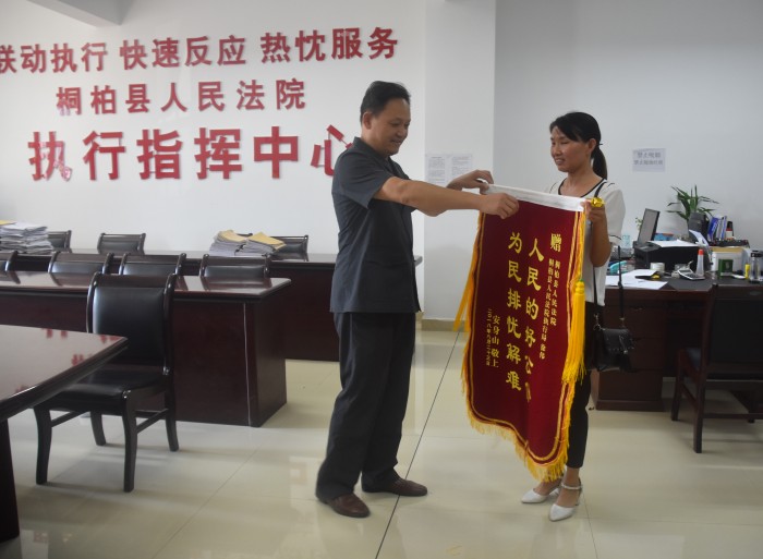 8月23日,桐柏县法院执行指挥中心响起了掌声,执行申请人安某的家人将一枚鲜红的锦旗送到执行员徐伟手中,并用热烈的掌声表示他们的感谢。