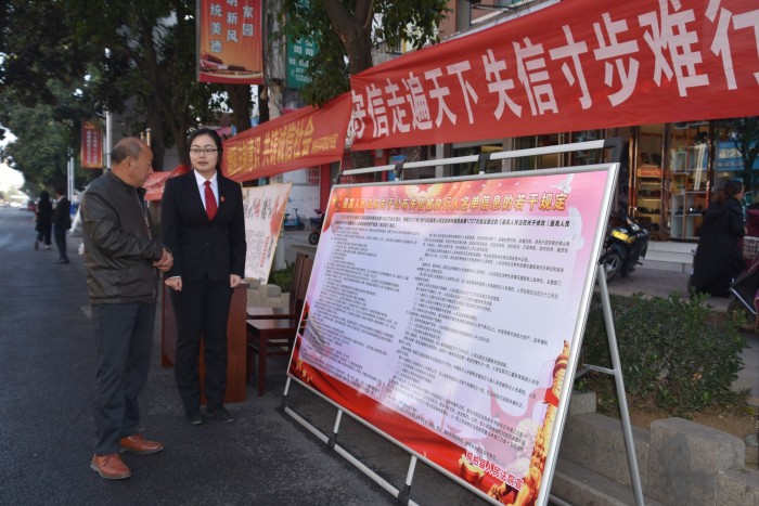干警们通过悬挂宣传标语,展示《最高人民法院关于公布失信被执行人名单信息的若干规定》展板,发放惩戒失信被执行人典型案例彩页等多种形式,在县城主干道旁,对相关法律法规进行宣传,营造对失信被执行人严厉打击的高压态势,创建社会诚信体系。