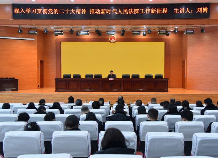 为深入贯彻学习党的二十大精神,2023年1月19日,桐柏县法院党组书记、院长刘博以《深入学习贯彻党的二十大精神,推动新时代人民法院工作新征程》为题,为全体干警讲授专题党课。