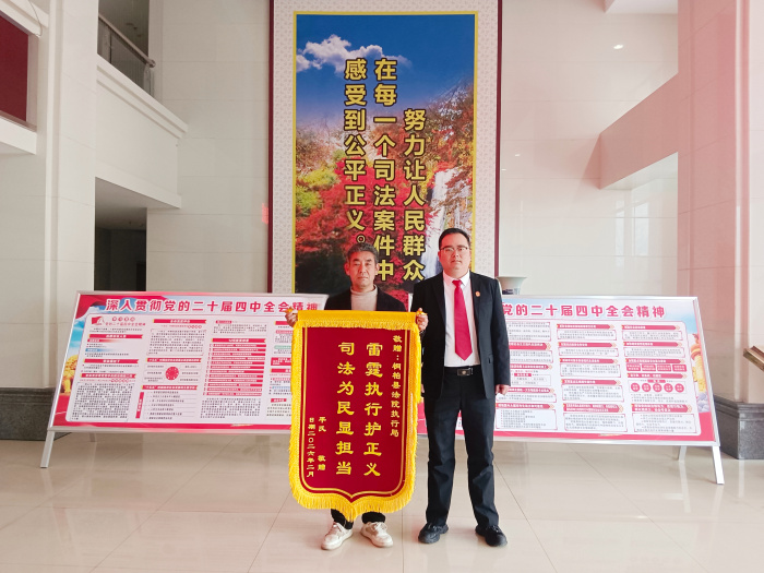 2026年2月24日,农历正月初八,春节假期后开工第一天,申请执行人郭某专程来到桐柏县人民法院执行局,将一面印有“雷霆执行护正义,司法为民显担当”的锦旗送到执行干警手中,对法院高效执行、倾心为民表示衷心感谢。
