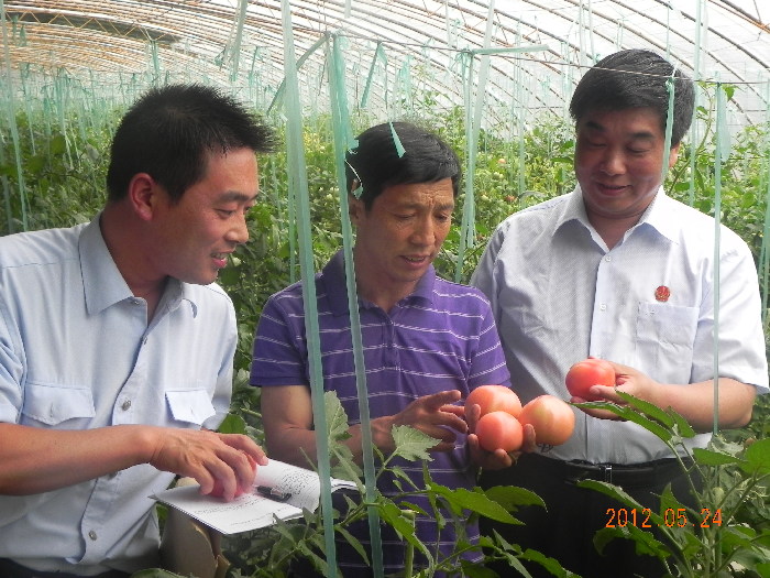 图为在黄岗镇岳新庄村大棚蔬菜种植基地,刘院长(右一)与菜农亲切交谈。